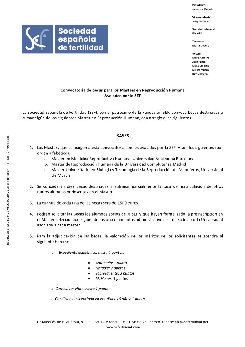 La Sociedad Española de Fertilidad (SEF), con el patrocinio de la Fundación SEF, convoca becas destinadas a favorecer la formación de sus socios mediante estancias en centros externos de reproducción humana asistida